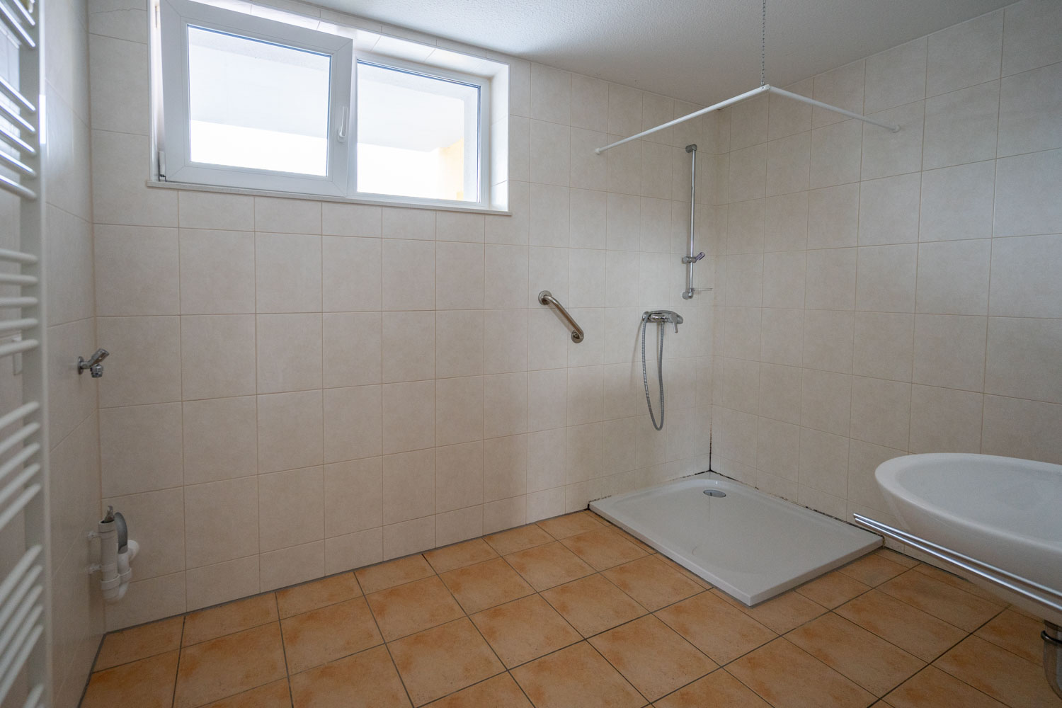 Das Badezimmer ist mit einer Dusche ausgestattet und verfügt über einen Waschmaschinenanschluss, was den Alltag besonders bequem macht. Die umweltfreundliche Pelletheizung sorgt für effiziente Wärme und hält die Heizkosten niedrig. Der offene Wohn- und Essbereich lädt zum Verweilen ein.