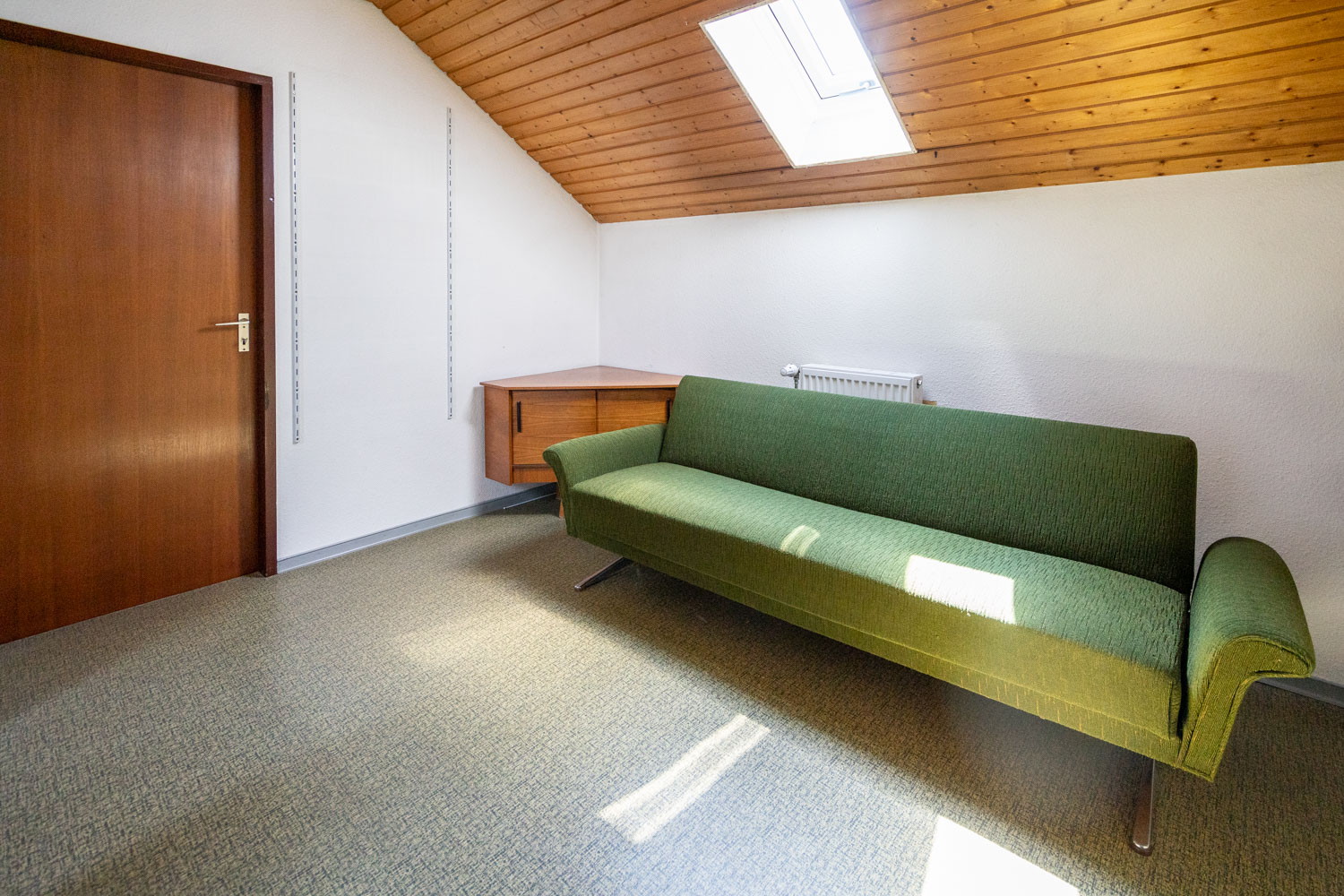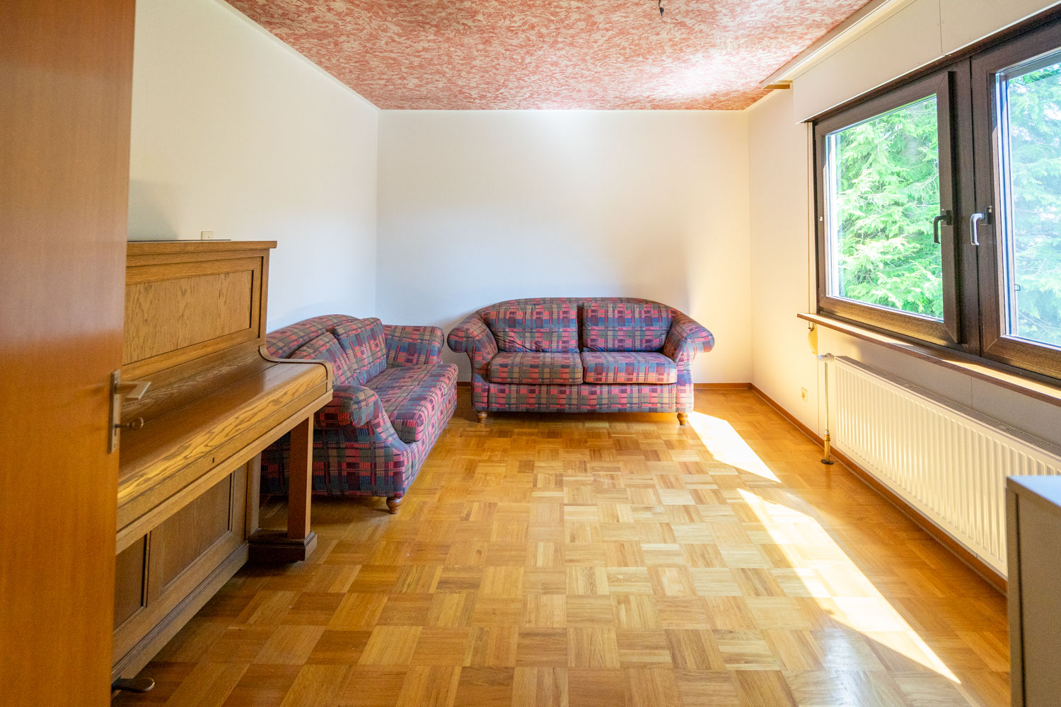 Das Dachgeschoss bietet ein weiteres Wohnzimmer, ein Badezimmer und ein zusätzliches Zimmer, das noch ausgebaut werden kann – perfekt für ein weiteres Kinderzimmer oder einen zusätzlichen Home-Office Bereich. Das voll unterkellerte Haus bietet zudem viel Stauraum, und die Garage befindet sich ebenfalls im Untergeschoss.