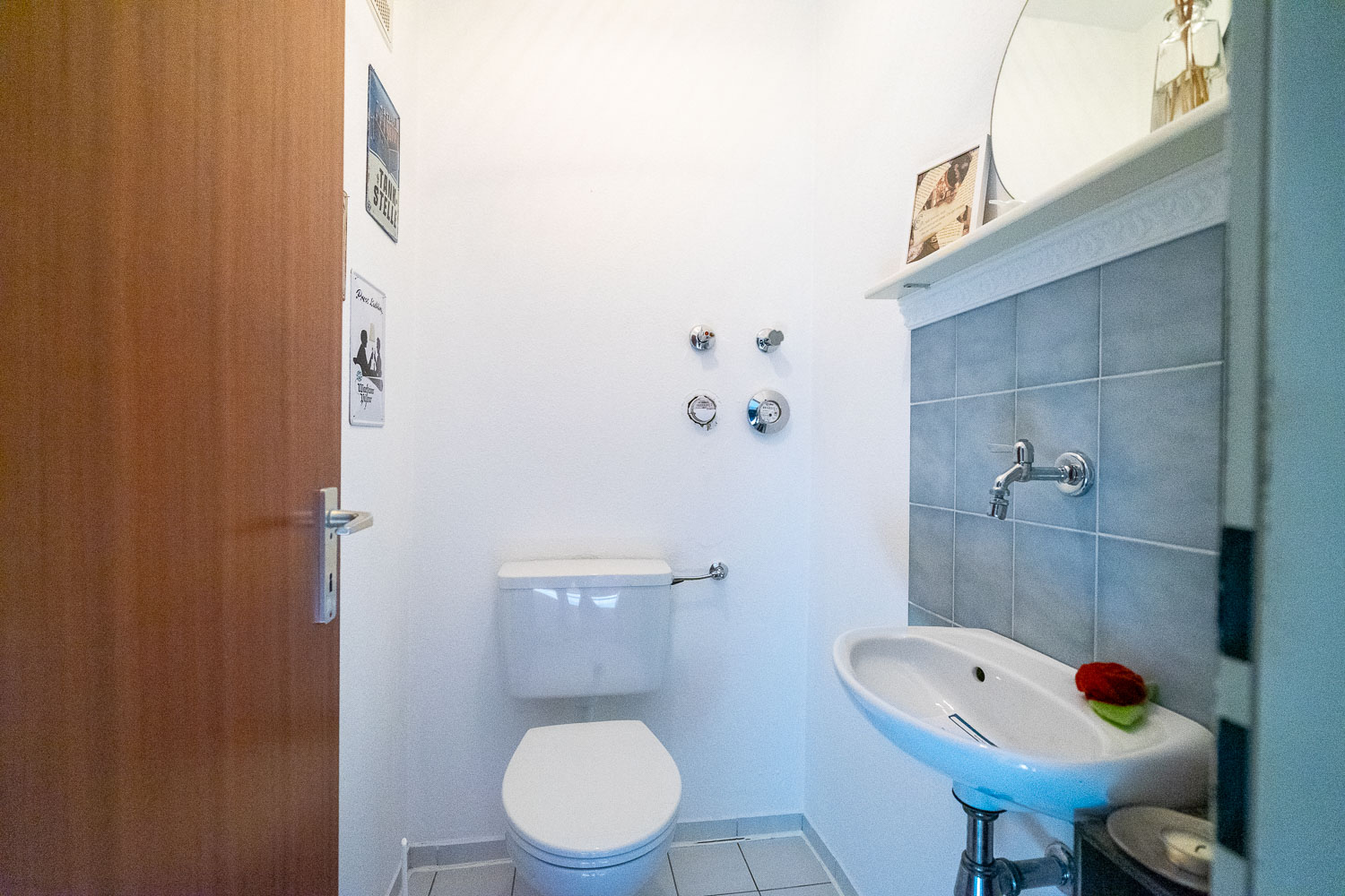 Die Wohnung umfasst ein Schlafzimmer, ein Kinderzimmer, ein Badezimmer, ein Gäste WC und eine geräumige Küche mit Essbereich.