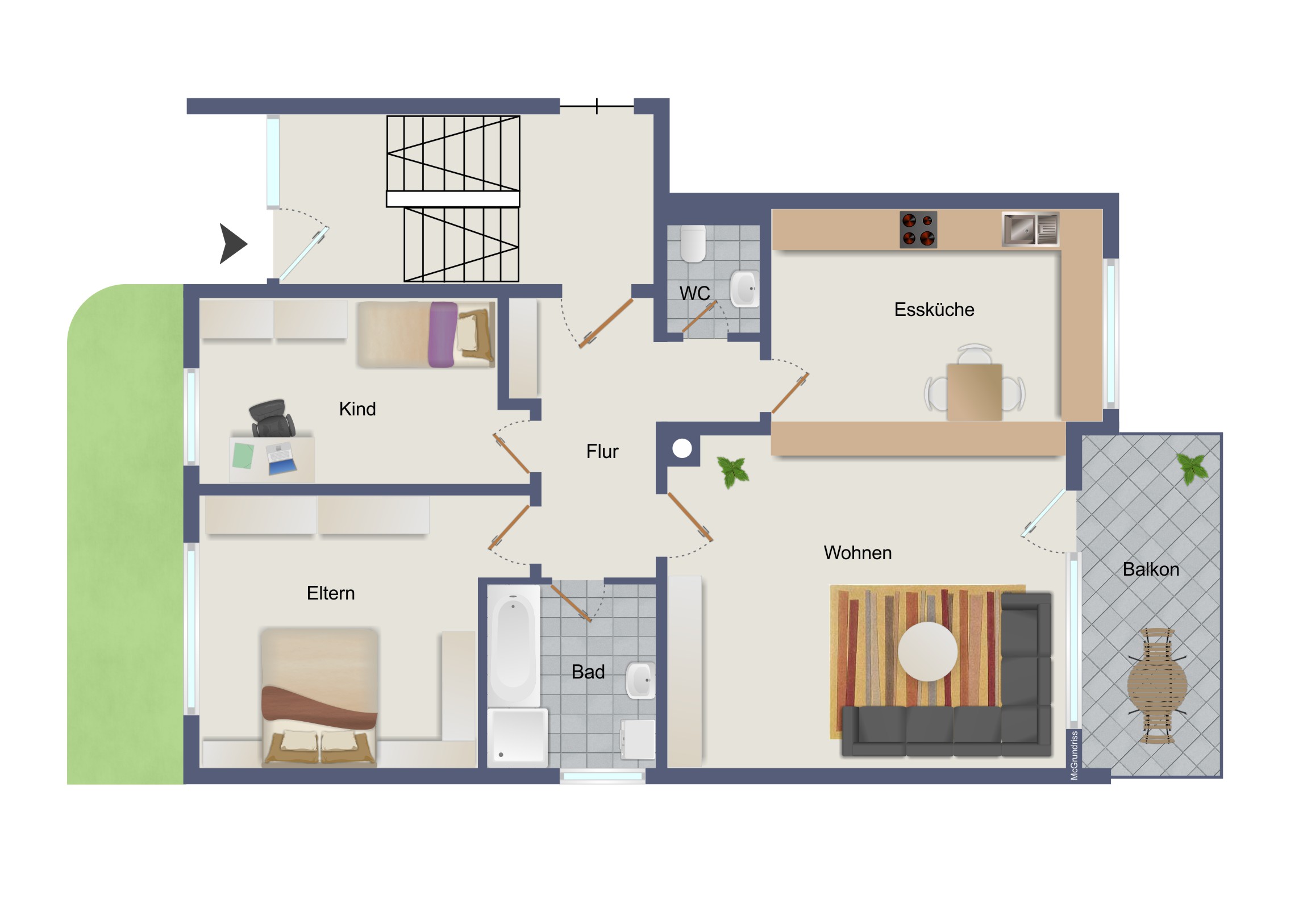 Diese 3-Zi.-Wohnung mit 79,04 m² Wohnfläche befindet sich im Erdgeschoss und ist nach Westen ausgerichtet.