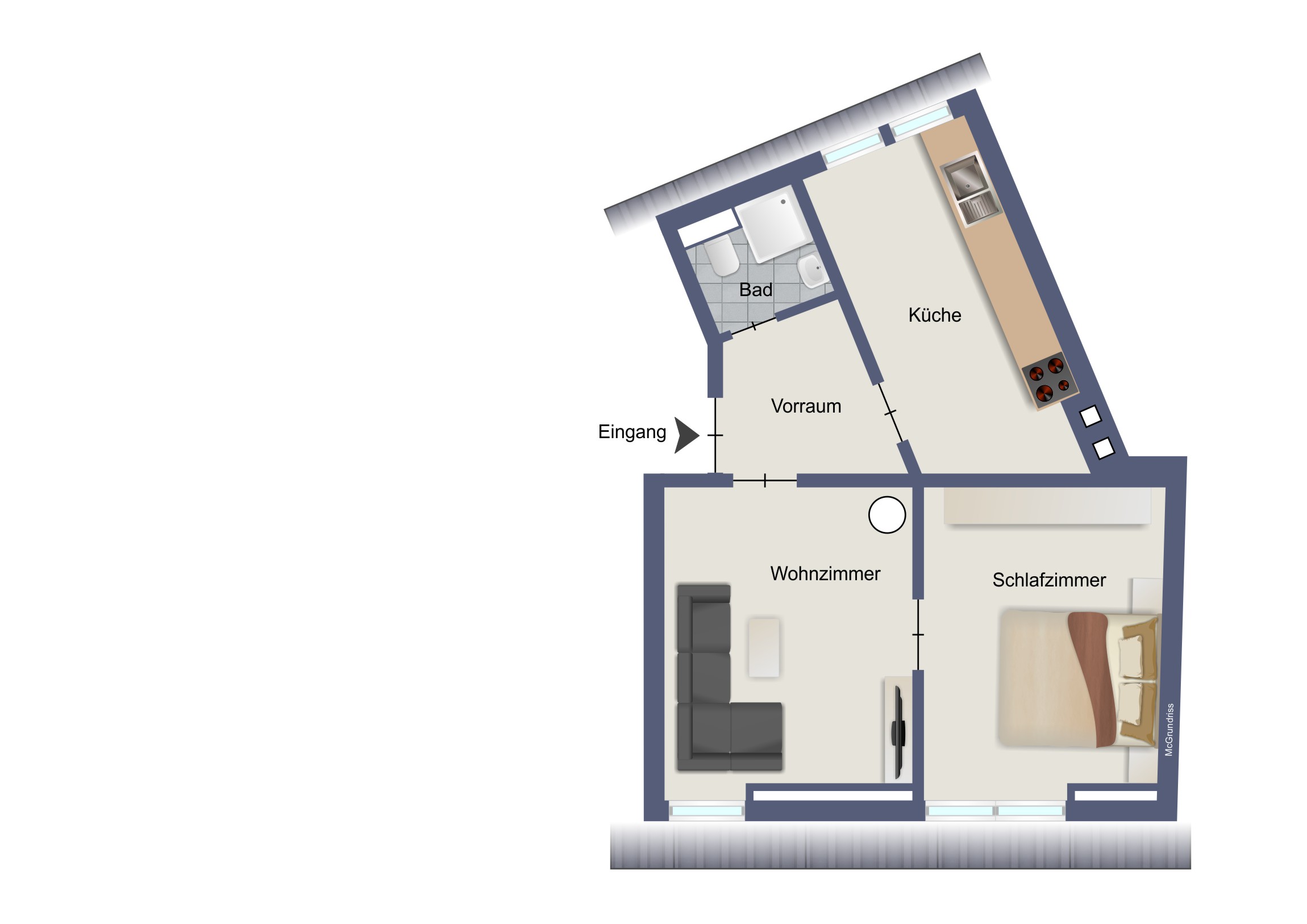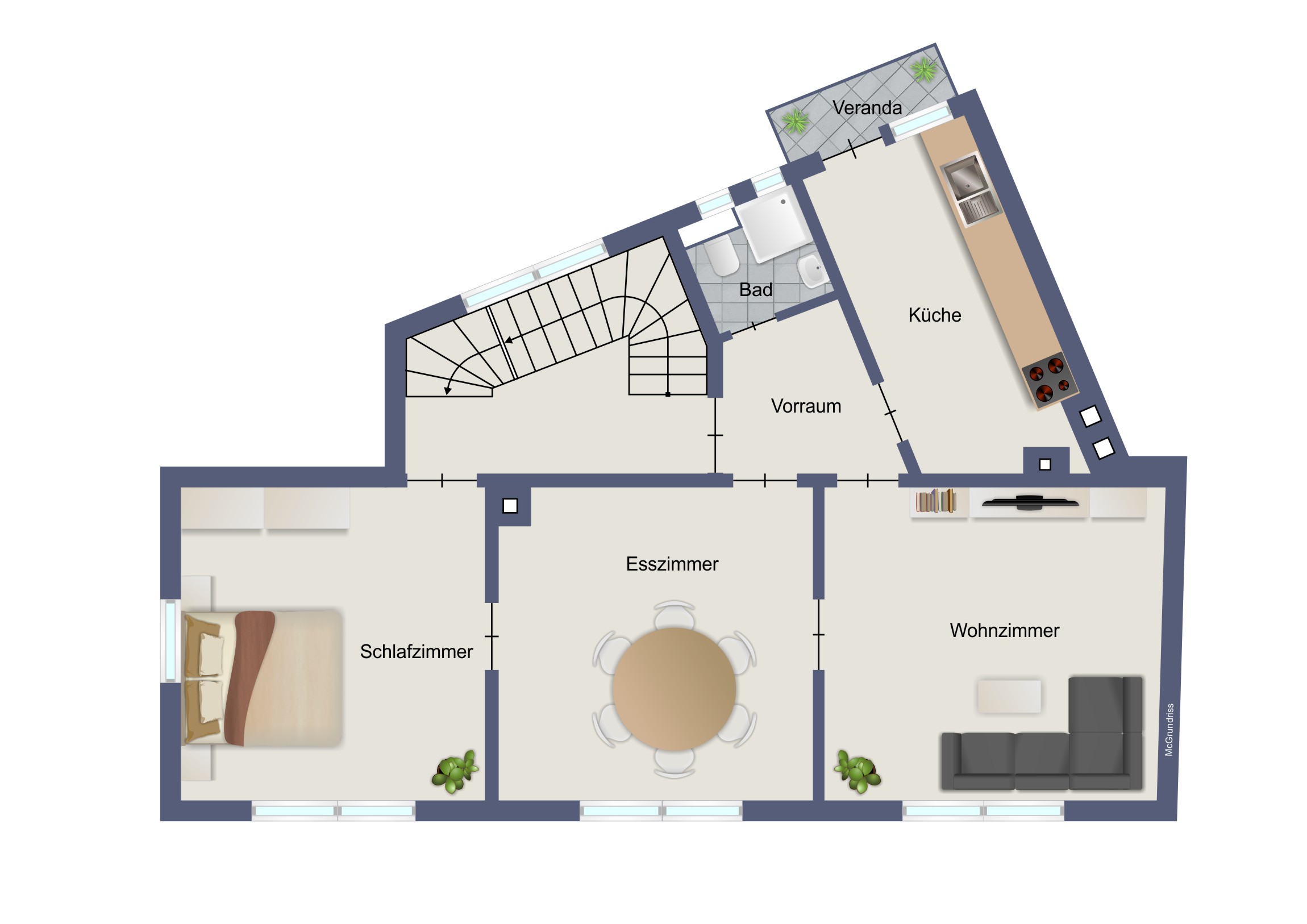 Die vier Wohnungen sind funktional gestaltet und bieten viel Tageslicht durch große Fenster. Im Erdgeschoss befindet sich eine großzügige 3-Zimmer-Wohnung, ideal für Familien oder Paare. Das erste Obergeschoss bietet eine ähnliche 3-Zimmer-Wohnung, die zusätzlich mit einem Balkon oder einer Terrasse ausgestattet sein kann. Im zweiten Obergeschoss befindet sich eine identische 3-Zimmer-Wohnung, perfekt für Singles oder Paare, während das Dachgeschoss mit seinen gemütlichen Dachschrägen eine weitere 2-Zimmer-Wohnung beherbergt – ideal als kleines Zuhause.