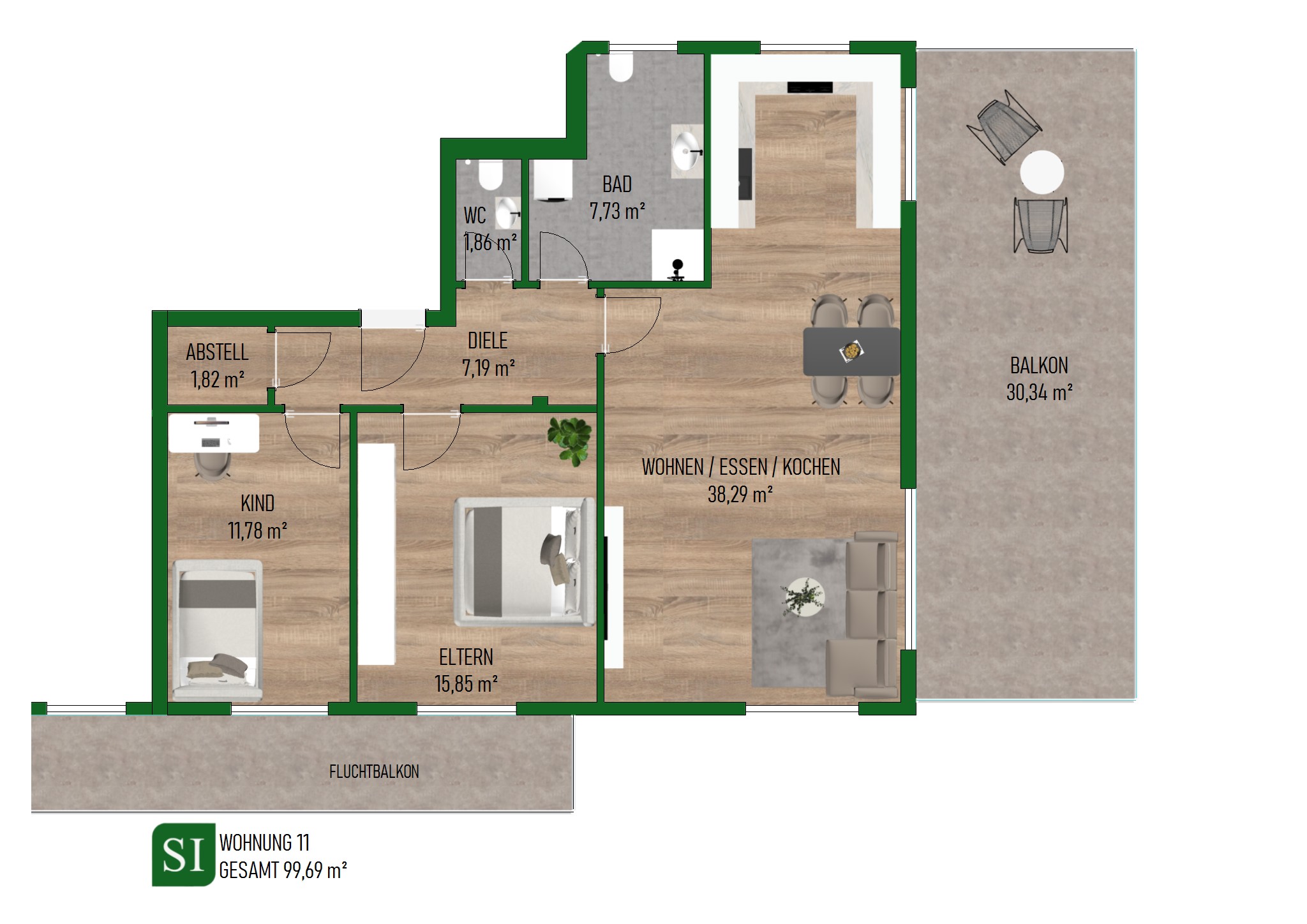 Die Wohnungen verfügen über zwei bis drei Zimmer und bieten Grundrisse, die auf die Bedürfnisse unterschiedlicher Zielgruppen – von Singles bis zu kleinen Familien – abgestimmt sind. Großzügige Fensterflächen sorgen für helle, lichtdurchflutete Räume, während Balkone und Terrassen den Wohnraum ins Freie erweitern. Ein besonderes Highlight stellen die Penthouse-Wohnungen dar, die mit einer modernen Smart-Home-Ausstattung, großzügigen Dachterrassen und einer gehobenen Innenausstattung ein exklusives Wohnerlebnis bieten.