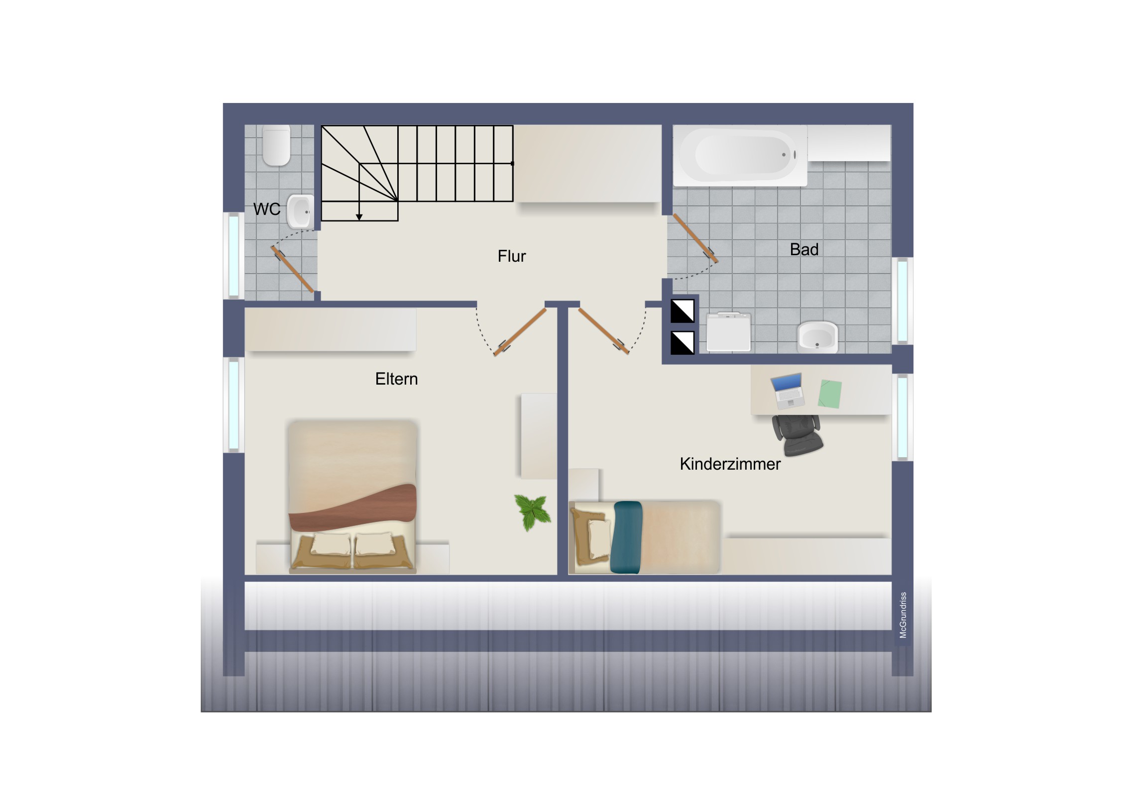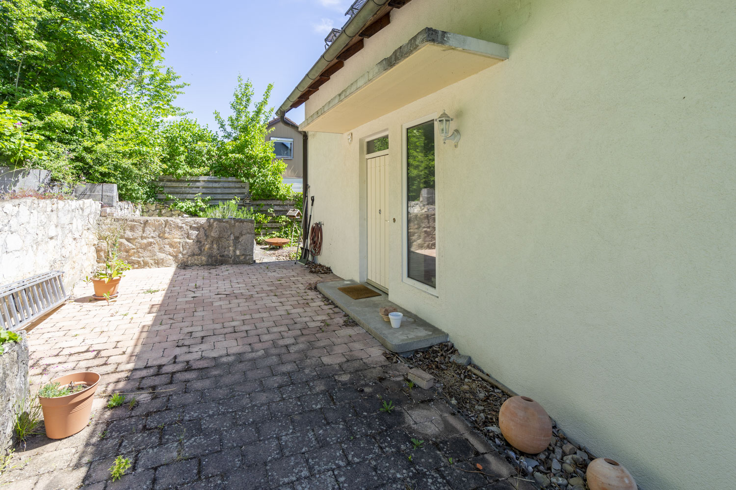Im Untergeschoss befindet sich ein Abstellraum sowie der Heizungskeller, ein weiteres Schlafzimmer mit angrenzendem Ankleidezimmer und dem Zugang zu der nach Süden ausgerichteten Terrasse mit Garten der zum spielen und entspannen für groß und klein einlädt.