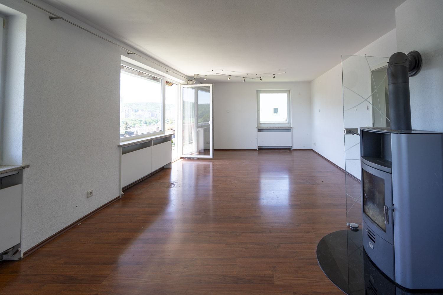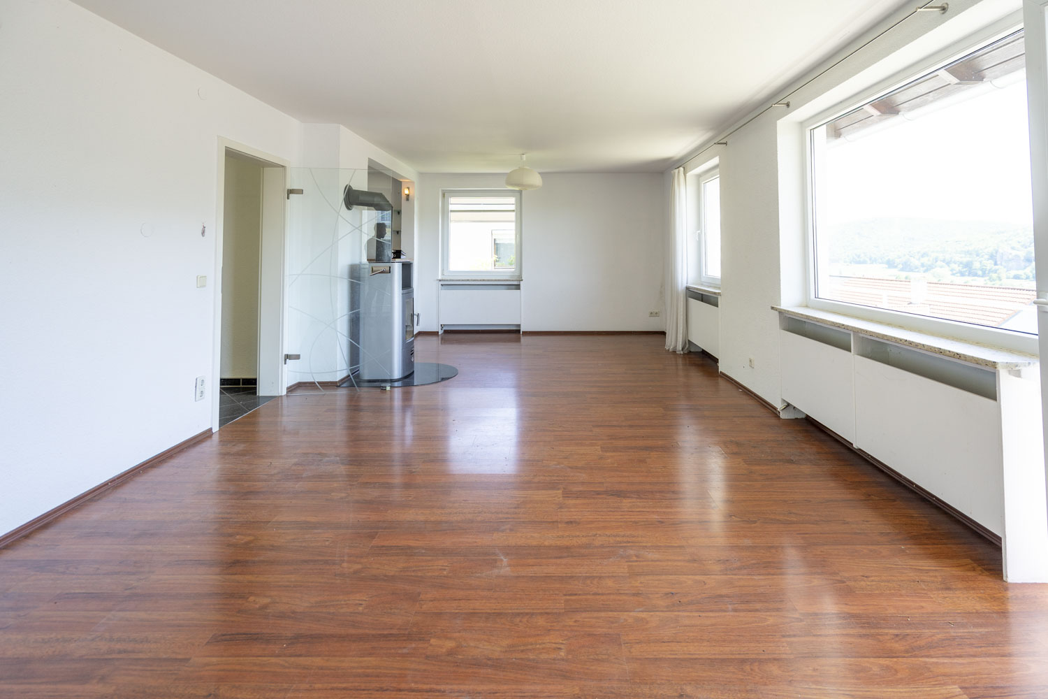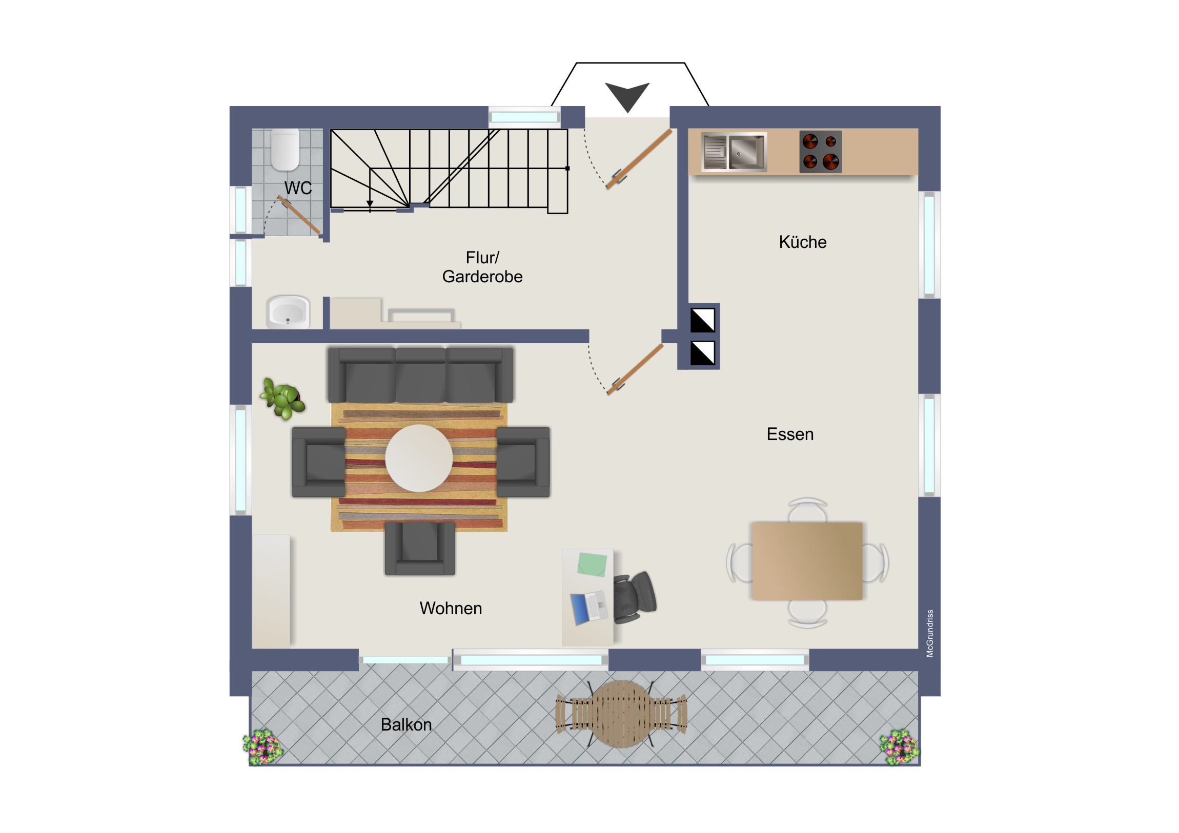 Der Mittelpunkt des Hauses bildet der offene Ess-, Küchen- und Wohnbereich, der sich durch große Fensterflächen und direkten Zugang zum nach Süden ausgerichteten Balkon mit Ausblick ins Grüne.